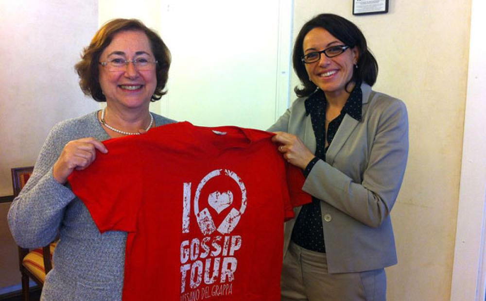 L'assessore comunale alla Promozione del territorio GIovanna Ciccotti rivece la maglietta del Gossip Tour dalla responsabile del progetto Laura Carraro