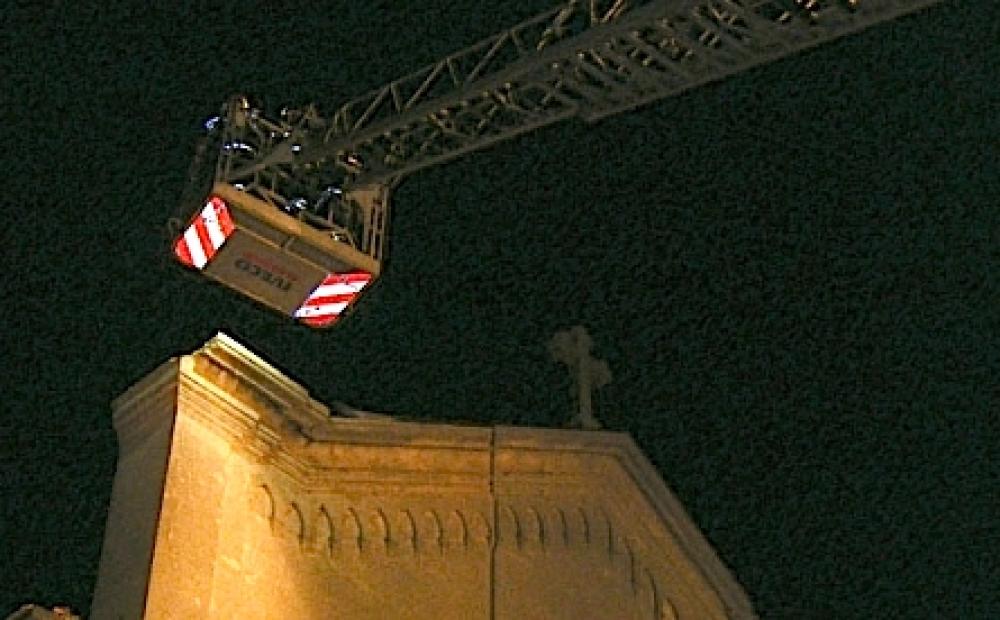 Il sopralluogo dei Vigili del Fuoco con l'autoscala sul cornicione danneggiato (foto Alessandro Tich)