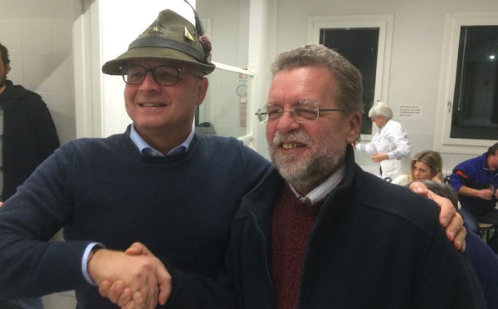 La stretta di mano col presidente della sezione alpina ANA Montegrappa di Bassano Giuseppe Rugolo si materializza invece nella sala mensa di Casa San Francesco, complice l'atmosfera di francescana solidarietà della cena offerta ai frequentatori della struttura dai Ristoratori Bassanesi, di cui riferiamo nel precedente articolo.