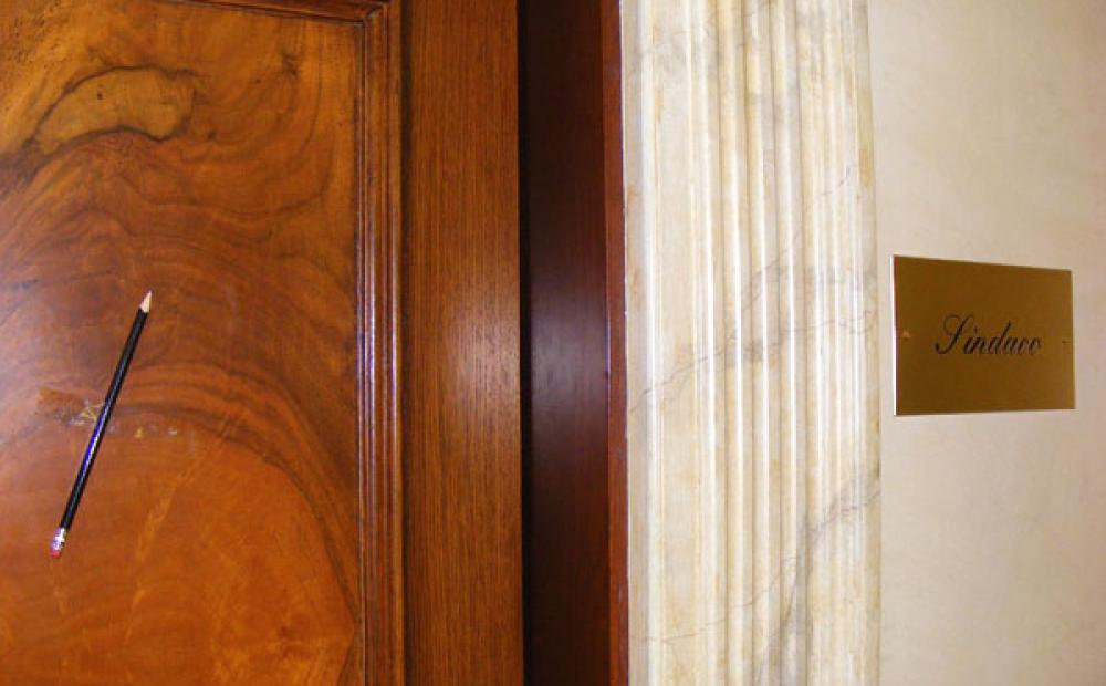 Il sindaco Poletto appende una simbolica matita alla porta del suo ufficio in municipio in solidarietà alle vittime della strage terrorista di Charlie Hebdo a Parigi
