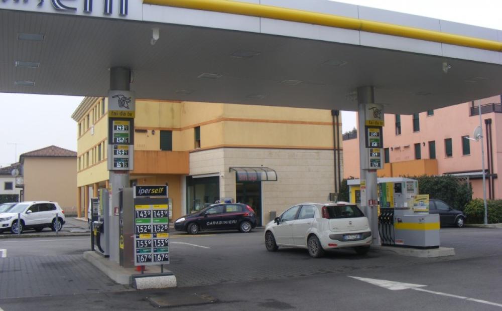 L'area di servizio del benzinaio Graziano Stacchio a Ponte di Nanto, con la scorta armata dei carabinieri (foto Alessandro Tich)