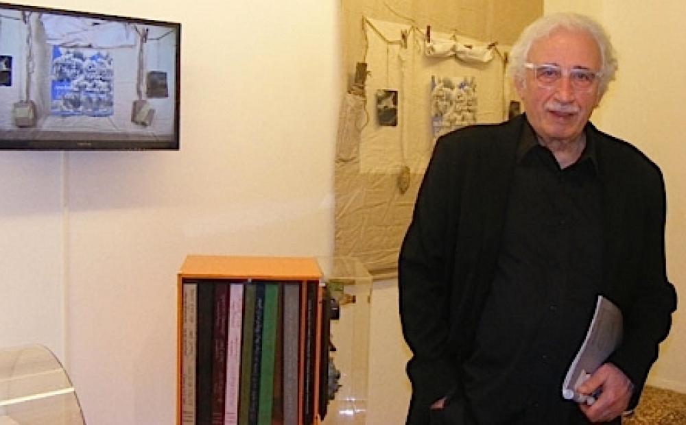 L'imprenditore e collezionista d'arte bassanese Luigi Bonotto accanto a "Rezept bibliotek" di Daniel Spoerri, una delle opere esposte a Venezia (foto Alessandro Tich)