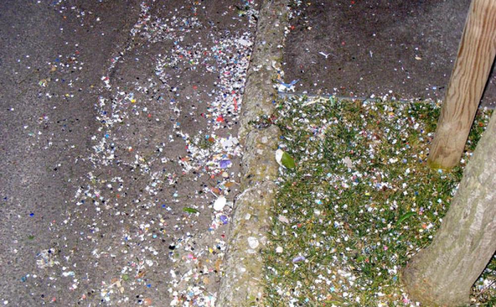 In viale Venezia, in particolare, i minuscoli e multicolori dischetti di carta sono profusi senza soluzione di continuità soprattutto sul lato sud della carreggiata, lungo l'incanalatura che costeggia il marciapiede, e poi ancora sul marciapiede medesimo e sulle basi degli alberi.