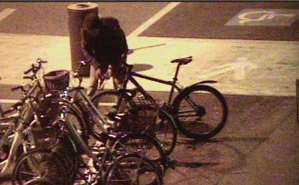 Il ladro in azione nel parcheggio del Grifone, mentre taglia il lucchetto con la grossa tenaglia, immortalato dalla videocamera di sorveglianza (fonte immagine: Carabinieri Bassano del Grappa)