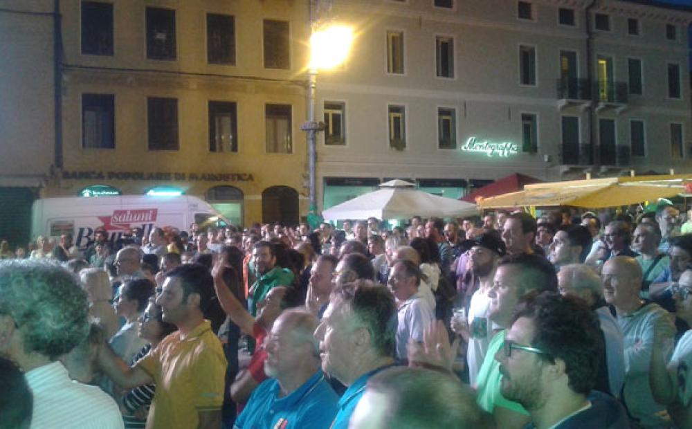 Piazza gremita per l'occasione: con birra, salumi, panini e una maxi-torta per 500 persone offerti gratuitamente da alcuni munifici sponsor e fornitori.