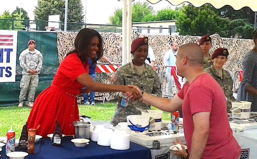 Il resoconto del vostro cronista della visita di Michelle Obama alla comunità militare americana a Vicenza. Con misure di sicurezza oltre ogni limite. E la First Lady, assieme alle due figlie Malia e Sasha, si mette a servire il gelato