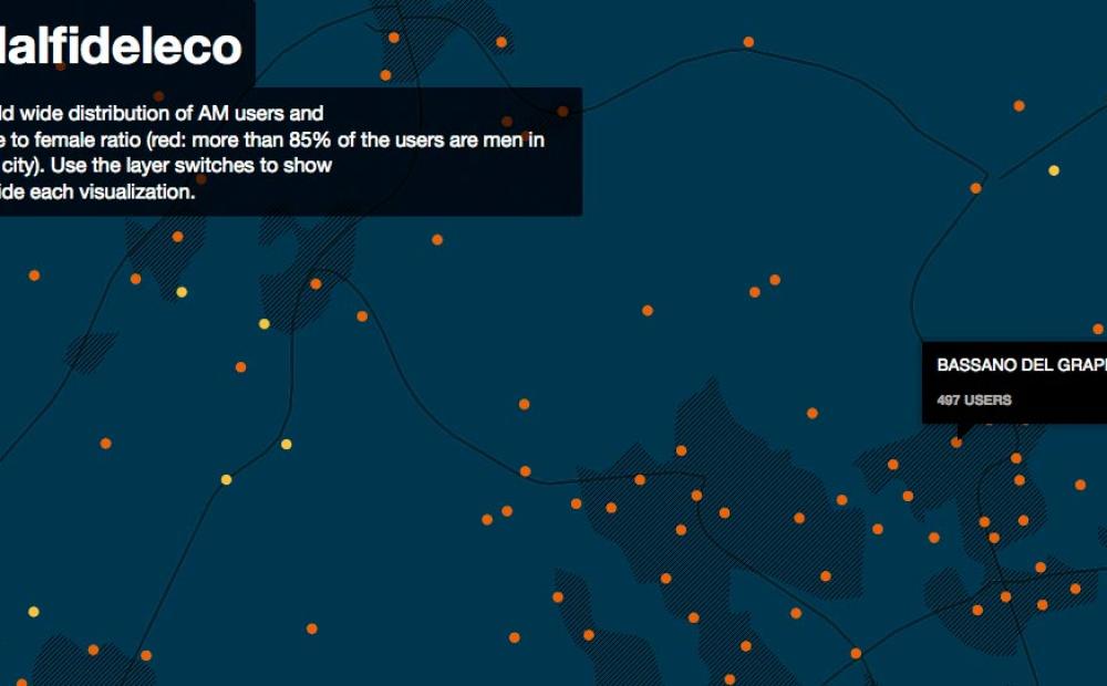 Il risultato si chiama MALFIDELECO, che in Esperanto significa “Infedeltà”: una mappa mondiale del tradimento online, in piattaforma CartoDB (tecnilogica.cartodb.com/viz/56e702fe-4693-11e5-8f79-0e853d047bba/public_map), che parte dalla rappresentazione della geografia dell'adulterio di tutte le terre emerse del pianeta dove il sito di Ashley Madison è attivo.