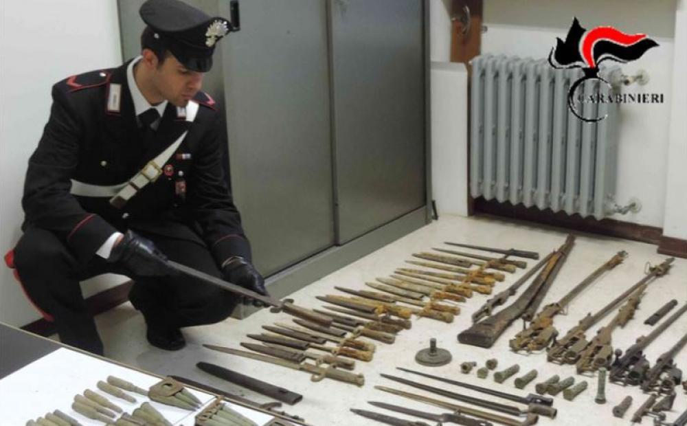 E ancora: 1 petardetto di innesco carico; 11 petardetti da innesco inerti; 1 caricatore bifilare da 40 colpi; 1 caricatore bifilare curvo; 4 bombe a mano inerti; 1 bomba da fucile inerte; 8 proiettili da artiglieria. Concludono il bellicoso elenco dei reperti rinvenuti e sequestrati dai militari: castelli, canne e otturatori per fucile; baionette per fucile; daghe e pugnali.