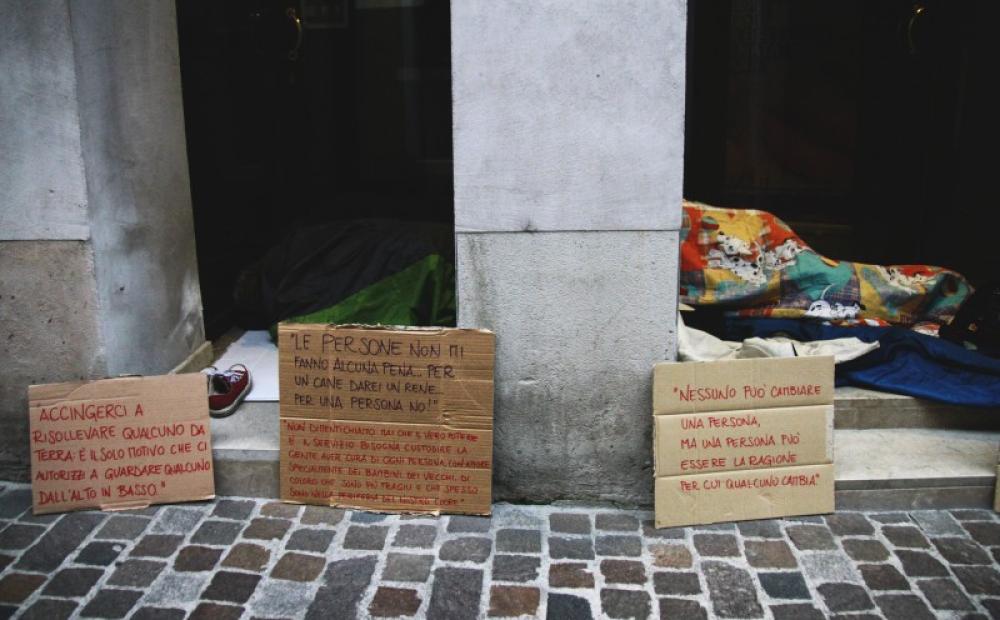 Barista di Bassano trova uno sconosciuto disteso all'ingresso del negozio confinante, chiama i carabinieri e si sfoga su Facebook. Oggi sul posto il blitz di un gruppo di giovani: “Come senzatetto per affermare che le parole hanno un peso”
