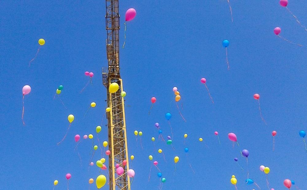 E' l'attimo fuggente nel corso del quale, contemporaneamente, i partecipanti alla cerimonia fanno liberare in aria centinaia di palloncini colorati, davanti alla grande gru del cantiere e verso l'azzurro di una giornata di splendido sole.