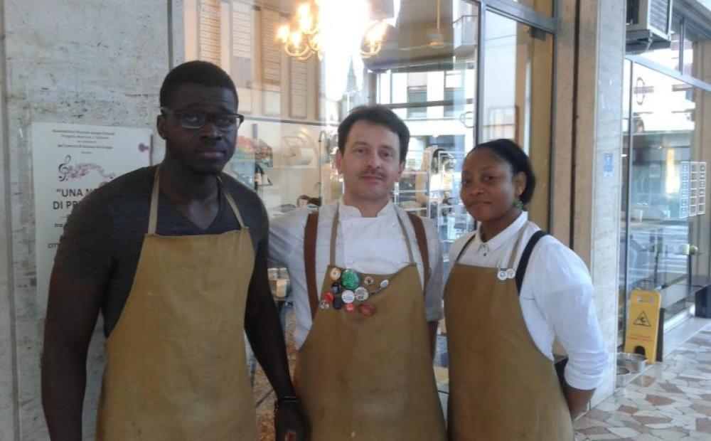 Assieme a Parise, nella prima delle tre domeniche dedicate alla colazione solidale, ci sono due suoi collaboratori: Nuris Valencia, originaria dell’Ecuador e Moussa Samb, senegalese, già da cinque anni presente nello staff di “Colazione in bottega”. Moussa parla anche il francese: un requisito importante per servire al banco o al tavolo gli immigrati aspiranti profughi che si presentano col biglietto per la consumazione. Il tutto in un clima di assoluta discrezione.