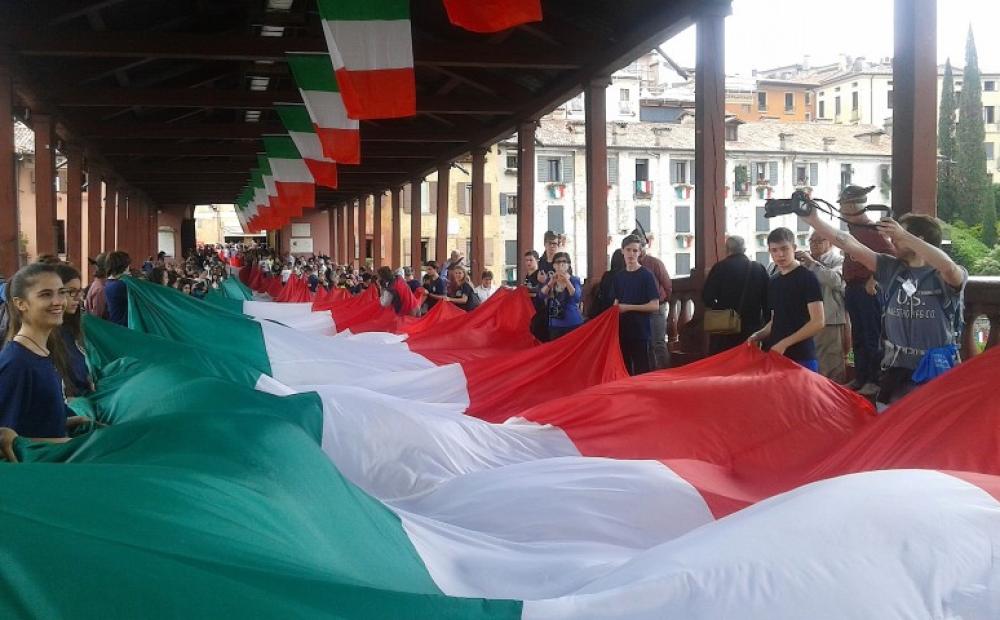 Festa di popolo a Bassano per la bandiera sfilante più lunga del mondo: 1797 metri di Tricolore sorretti e portati per la città da oltre duemila persone. Cronaca di una mattinata perfetta, tra solennità patriottica e provocazioni indipendentiste