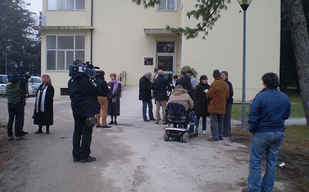 Il presidio davanti all'ambulatorio, preso d'assalto dai giornalisti
