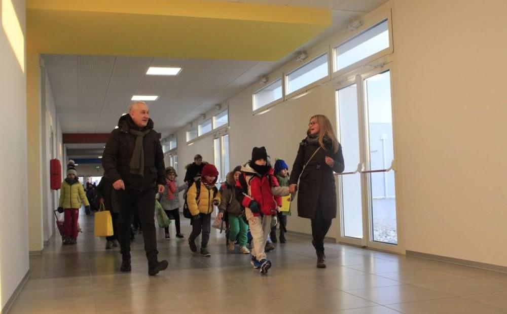 Il sindaco Bordignon con una classe di alunni nel nuovo Polo scolastico