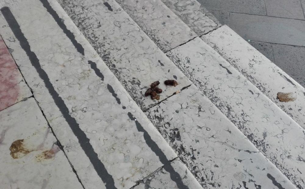 Ecco la scena che si è presentata questo pomeriggio sui gradini del sottoportico di via San Bassiano, all'imbocco della piazza principale di Bassano del Grappa. Una notevole porzione di escrementi abbandonati in uno dei punti di massimo passaggio per i pedoni in centro storico.