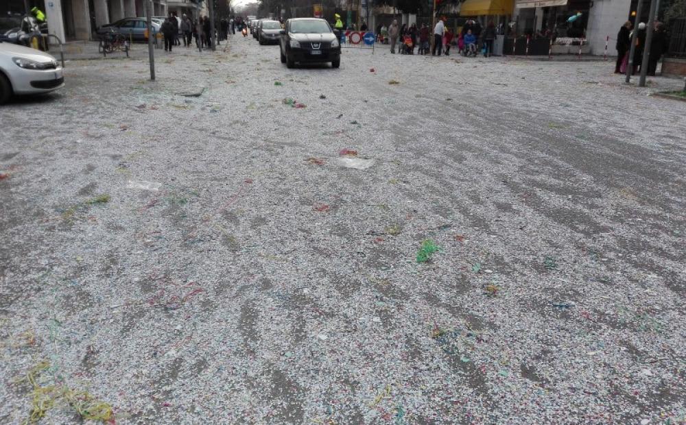 E i coriandoli per strada, sopravvissuti al passaggio dei mezzi dello “spazzamento” di Etra?