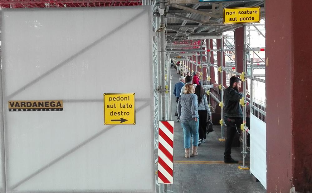 “Pedoni sul lato destro”, “Non sostare sul Ponte”, “Cicli a mano”, “Favorire il transito dei pedoni”. È quanto mai ridondante la cartellonistica, oltre a quella di cantiere, affissa ai due opposti ingressi del Ponte degli Alpini.
