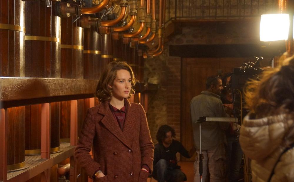 Cristiana Capotondi sul set della fiction davanti all'alambicco della distilleria Poli (foto fornita da Poli Distillerie)