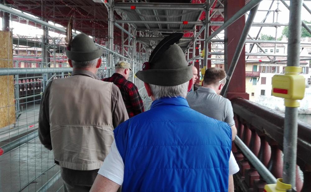 C'è chi la prende allegramente: mentre faccio un giro di perlustrazione nel pomeriggio, alla Grapperia Nardini un gruppo di Alpini, già in preda agli spiriti del distillato della fiction, intona (si fa per dire) l'inevitabile “Sul Ponte di Bassano”.