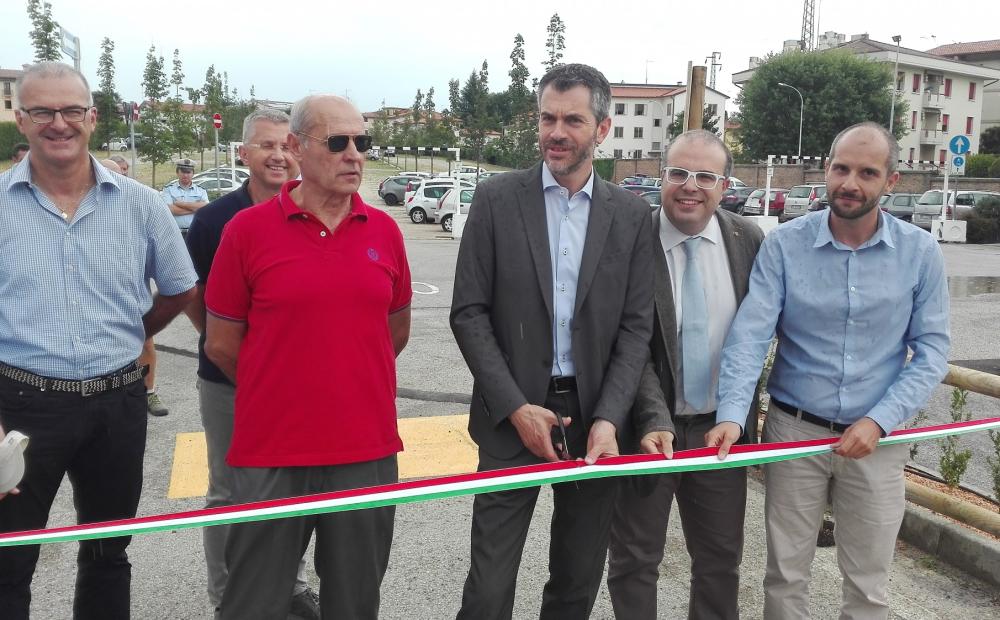 Il taglio del nastro della nuova area attrezzata avviene sotto qualche gocciolina d'acqua. Niente di che, rispetto al piovasco che si era abbattuto su Bassano un paio d'ore prima. Risulta comunque quanto mai provvidenziale, per non inzuppare troppo i bloc notes dei cronisti, il gazebo sotto il quale è stato predisposto un frugale rinfresco inaugurale.