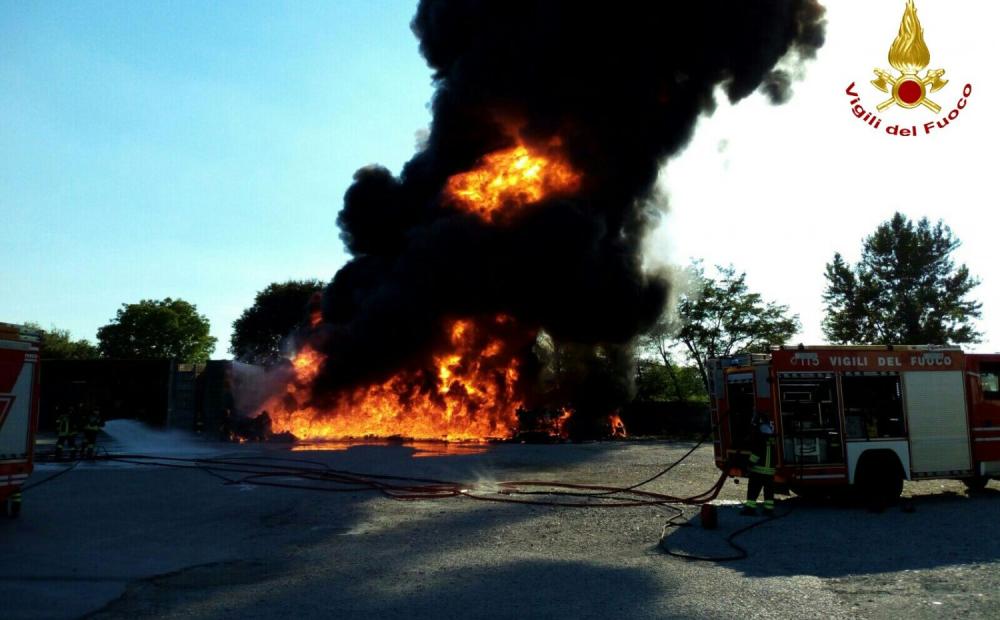 Bruciano motrice, rimorchio e un centinaio di cassoni di plastica nel piazzale di un'azienda. Si sprigiona un'alta colonna di fumo nero. Rogo alla fine domato da quattro squadre dei Vigili del Fuoco