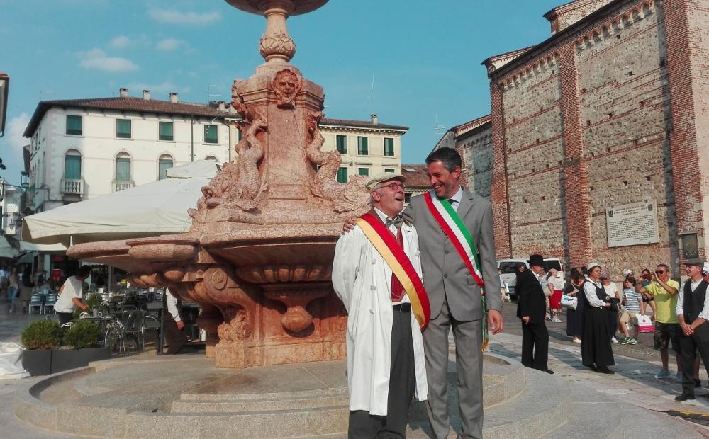 Alla cerimonia di scoprimento dell'opera restaurata, coordinata dal presidente delle Arti per Via Gianni Posocco, interviene infatti il sindaco di Bassano Riccardo Poletto, con fascia tricolore, affiancato dal suo esimio predecessore Antonio Giaconi Bonaguro, con fascia giallo-rossa. Che altri non è che un figurante delle Arti per Via, in costume d'epoca, chiamato nell'occasione a reincarnare l'illustre amministratore e benefattore.