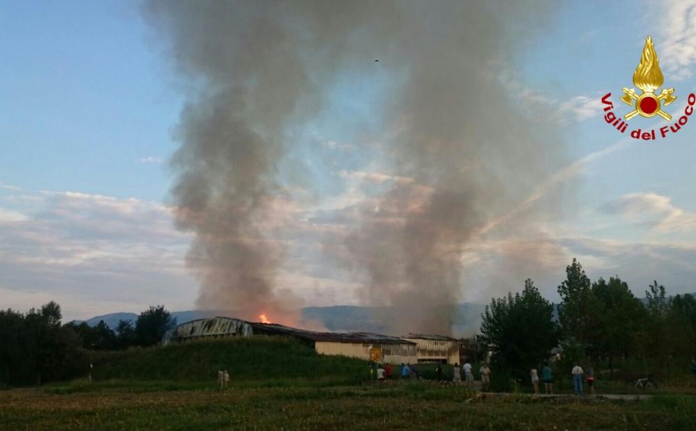 Vasto incendio in un capannone avicolo a Mason Vicentino. Vigili del Fuoco intervenuti in forze per spegnere le fiamme. All'interno dello stabile bruciato decine di migliaia di capi di allevamento