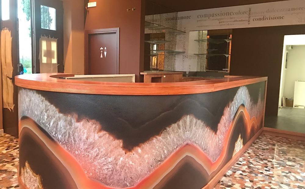 Nell'interior design prevalgono le tonalità che vanno dal color castagna-terra di Siena fino al crema-nocciola: sembra quasi l'interpretazione cromatica di un caffè macchiato. L'organizzazione del limitato spazio interno disponibile è comunque funzionale alle esigenze di un locale che avrà la caffetteria e l'angolo aperitivi tra i suoi punti di forza per poi puntare a un adeguato utilizzo del suggestivo plateatico esterno nella bella stagione. Su una parete campeggia un pannello con una sequenza di parole scritte come “amicizia”, “condivisione”, “luce”, “saggezza”, “purezza”, “compassione”, “colore”, “dolcezza”, “amore”, “coraggio”. Un inedito dizionario, perlomeno all'interno di un locale pubblico, dei buoni sentimenti. Ottimismo e positività da spolverare sopra il cappuccino.