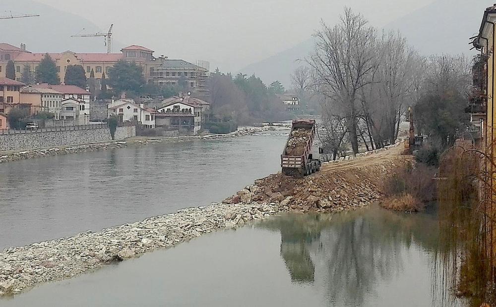 Sono i due mezzi della ditta subappaltatrice Brenta Lavori, autorizzata ad operare in alveo, impegnati in questi giorni sotto la supervisione della Vardanega a costruire la nuova strada-barriera di tura in mezzo al fiume tra la base operativa di isola Pusterla e l'area di cantiere in asciutta delle prime due stilate da ripristinare.