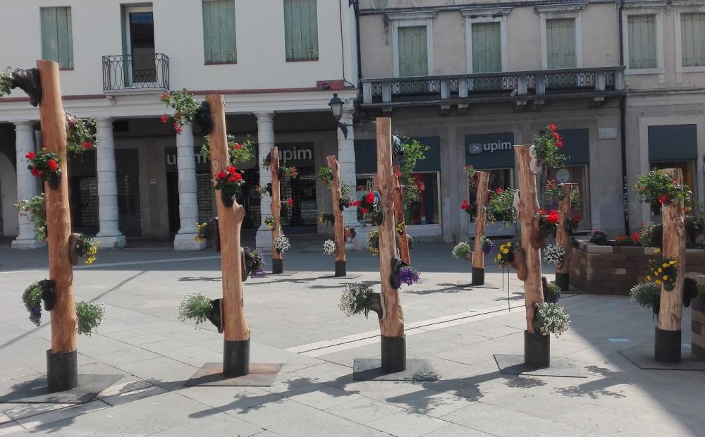 I pali sono avvolti da una spirale “che richiama il DNA della Vita”, formata da scarpe usate “ad indicare il cammino dell'Uomo” che fungono da contenitori per le piante fiorite.