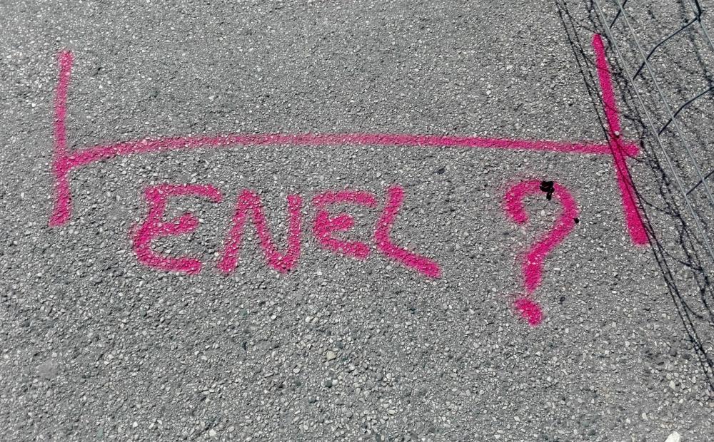 “Enel?”. Questa sì, che è una bella domanda. La scritta, fatta con lo spray, è segnata sull'asfalto alla confluenza tra viale delle Fosse e via Da Ponte a Bassano, immediatamente a ridosso del limite di cantiere del primo lotto dei lavori di adeguamento della rete idrica e fognaria in via Da Ponte, che sono stati commissionati da Etra e che interesseranno la zona fino a fine maggio. È una delle scritte di indicazione ad uso della ditta appaltatrice Brenta Lavori Srl prima degli scavi, relative all'ubicazione dei sottoservizi. Solo che l'indicazione in questione, in questo caso, è accompagnata da un punto interrogativo. Il quale ne genera, inevitabilmente, degli altri.