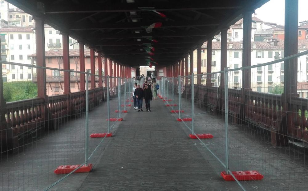 “A Bassano non abbiamo “la gomma del Ponte” ma “il Ponte di gomma” che si stringe sempre di più.” La battuta è di un nostro affezionato lettore, che mi ha segnalato l'ultima (per oggi) novità riguardante il nostro malandato monumento: il restringimento del passaggio pedonale in mezzo alle transenne. Non è dato al momento sapere se la sezione ridotta riservata ai passanti sia dovuta a un casuale riposizionamento delle transenne ad opera dell'addetto dell'Etra che periodicamente dà una ripulita al pavimento dell'aspirante Monumento Nazionale (che tuttavia si presenta sporco e cosparso di cacche di piccioni, come sempre) oppure a una misura temporanea per limitare assembramenti pedonali dopo l'allarme sul rischio di cedimento del manufatto, dissestato nei materiali lignei delle fondazioni delle stilate 3 e 4, in mancanza di ulteriori e a quanto pare imminenti interventi di messa in sicurezza. Fatto sta che al momento attuale il Ponte è transitabile per circa un terzo della sua superficie.