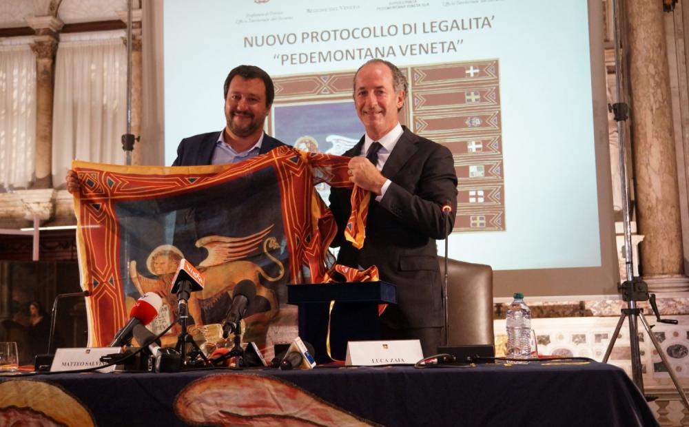 Il ministro dell’Interno Matteo Salvini e il presidente della Regione del Veneto Luca Zaia hanno firmato oggi, a Venezia, il nuovo Protocollo di Legalità per la realizzazione della Superstrada Pedemontana Veneta, attualmente la più grande infrastruttura in corso d’opera in Italia, con un costo complessivo pari a 2 miliardi 258 milioni, per 94 chilometri di percorso attraverso 36 Comuni tra le province di Vicenza e Treviso, con 16 caselli e con una percentuale già cantierata del 50% circa.
