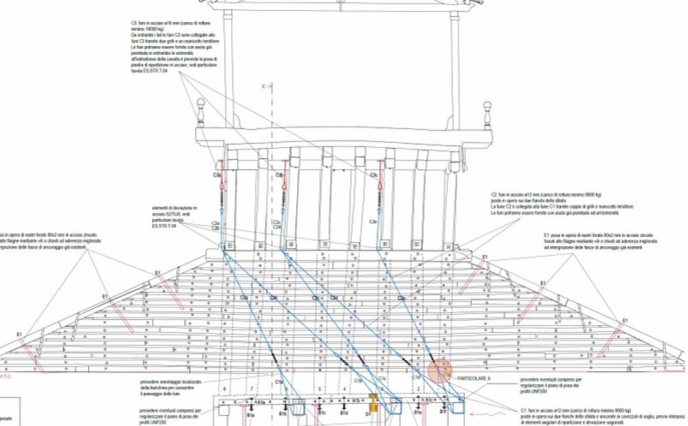 Dunque la storia si ripete - tale e quale - e, anche se riguarda due diverse coppie di stilate, sia nel primo caso (2016) che nel secondo (2018) al centro delle attenzioni di somma urgenza vi è la stilata numero 3. Due anni fa incombeva la stessa prospettiva che incombe adesso: il rischio delle piene autunnali del fiume. Già allora il nostro monumento, da questo punto di vista, non era messo bene. Come scrivevo all'epoca, “ad oggi il Ponte è tenuto in sicurezza dai lavori preventivi eseguiti nell’ultimo anno: alleggerimento della massicciata, puntellazione subacquea della seconda stilata e quindi puntellazione delle tre stilate rimanenti. Ma i puntelli poggiano direttamente sul letto del fiume, che in caso di Brentana li renderebbe instabili”. Da qui la delibera di giunta comunale di approvazione dei lavori di somma urgenza sulle due stilate centrali “per la salvaguardia pubblica e del manufatto”. La soluzione tecnica prescelta nel 2016 - su progetto esecutivo del prof. ing. Claudio Modena - prevedeva in sostanza l'applicazione subacquea di placche di acciaio sulla vecchia trave di soglia del Casarotti e l'imbragatura con funi di acciaio dei pali di sostegno, per convogliare la spinta orizzontale del fiume sulle strutture meno compromesse del manufatto. Le famose “tiracche”, che ancora oggi fanno bella mostra di sé di sui quei rostri che furono oltretutto oggetto in quella occasione anche di un'opera di consolidamento per “reggere meglio all'impatto di materiali trasportati dalla corrente in piena”.