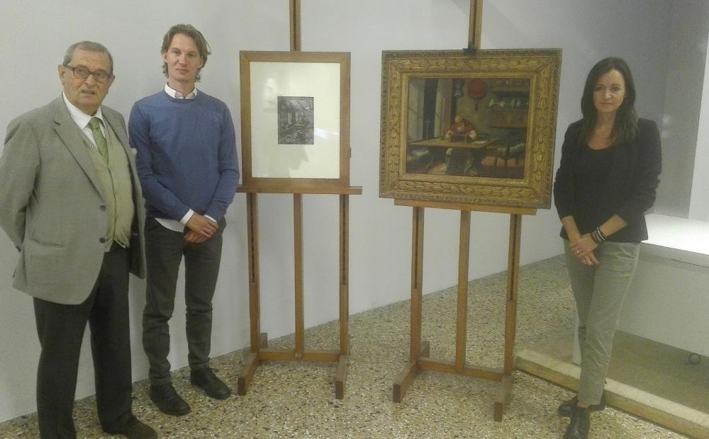 Fernando Rigon, Giovanni Cunico e Chiara Casarin con i due San Girolami conservati a Bassano: l'incisione di Dürer e il dipinto riattribuito a Lotto (foto Alessandro Tich)