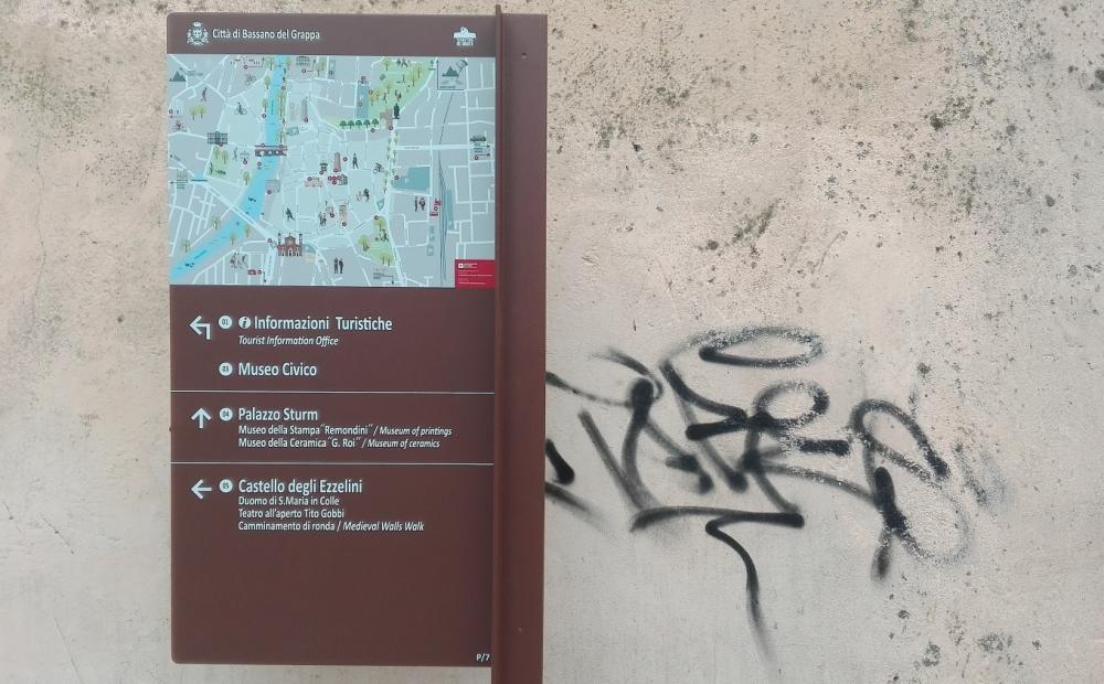Nella parte superiore destra di ciascuna tabella - ed è questa una delle principali novità - compare il logo del Marchio d'Area “Territori del Brenta”, alla stessa altezza dello stemma civico della Città di Bassano del Grappa. Le diciture invece sono bilingue in italiano e in inglese, ma non tutte. Sulle tabelle di indicazione dei luoghi più vicini da raggiungere compare anche la mappa del centro storico: ed è la famosa mappa turistica dell'Associazione Chilometro Quadro. Ma su questa ritornerò un po' più avanti.
