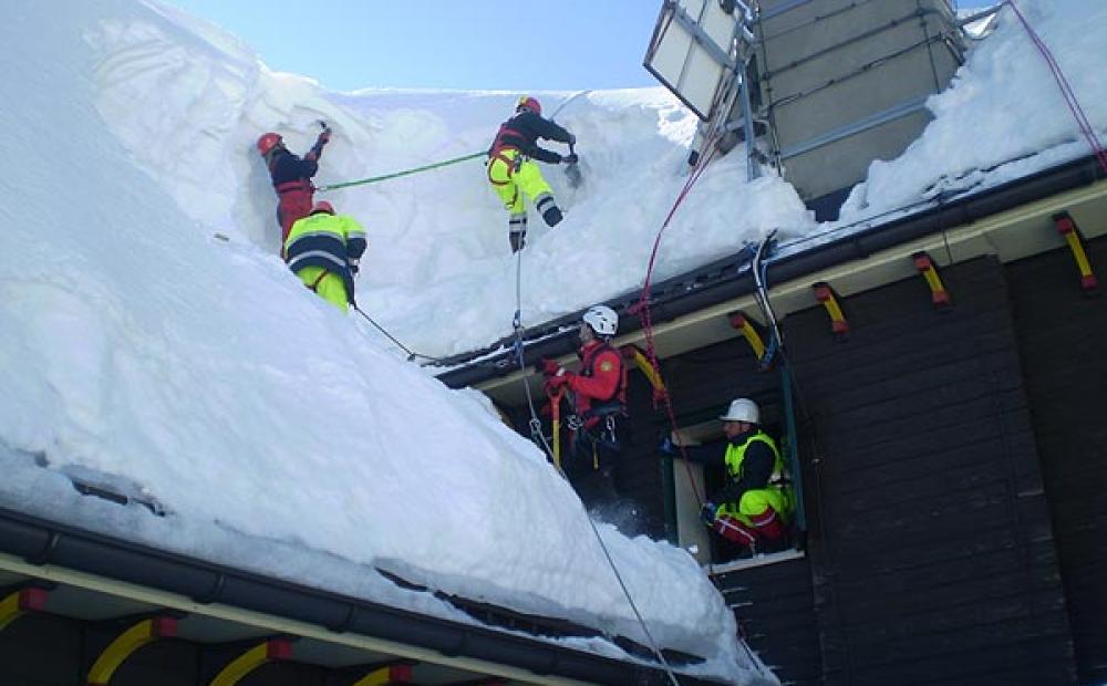 Volontari all'opera per sgomberare i quattro metri di neve accumulatisi sul tetto nella stagione invernale