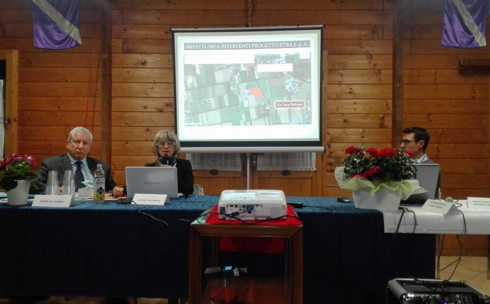 Lo scopo della serata è quello di riferire i risultati di un'indagine commissionata dal Comitato stesso “per evidenziare la reale situazione dell'area in questione” e affidata alla dottoressa forestale Marina Lecis, consulente ambientale e CTU (Consulente tecnico d'ufficio) del Tribunale di Padova, che siede al tavolo dei relatori assieme all'avv. Giorgio Destro, professionista legale di Padova che cura gli interessi del Comitato. La dott.ssa Lecis è un'autentica autorità tecnica in materia: tra le varie questioni di inquinamento ambientale che sta seguendo, solo per fare un unico ma significativo esempio, c'è anche il caso Miteni con l'emergenza PFAS.