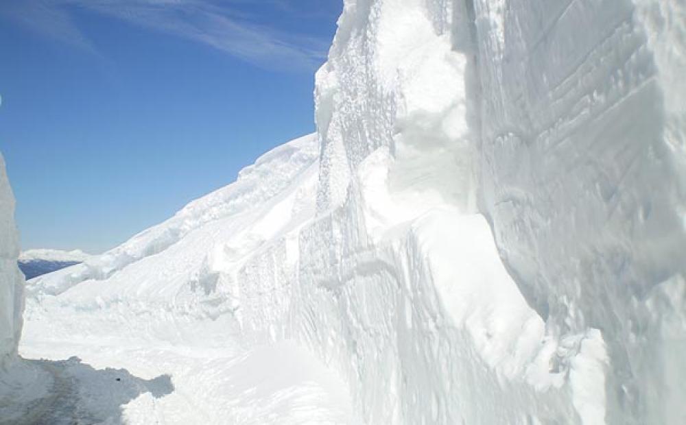 La strada chiusa al traffico tra due alte pareti di neve