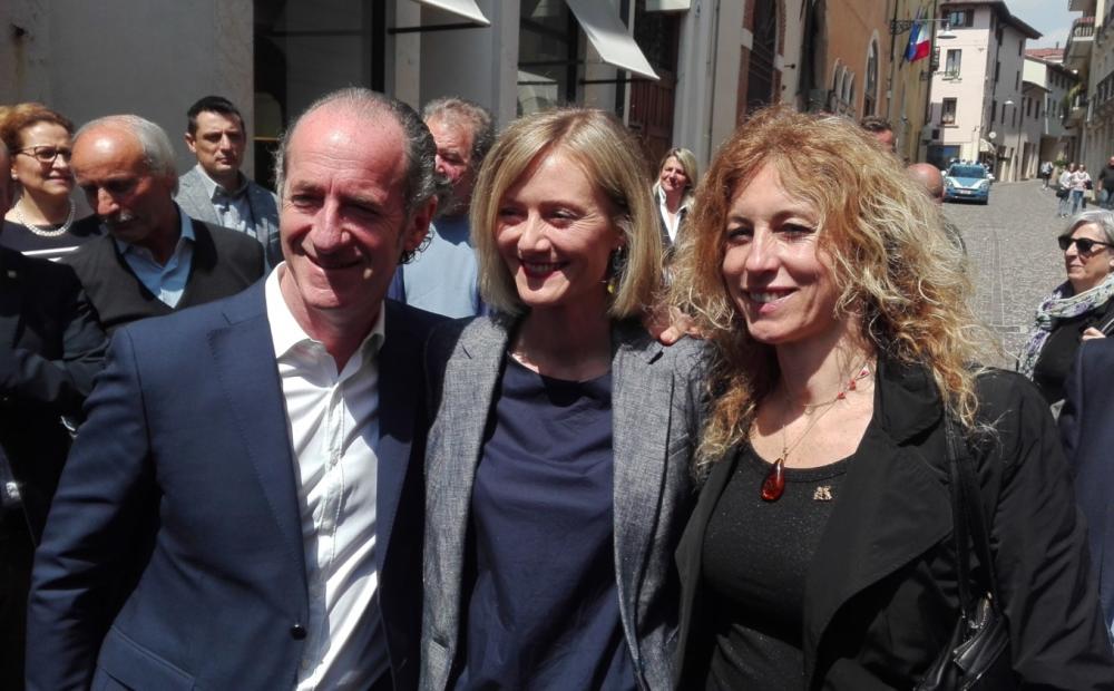 Il candidato sindaco del centrodestra Elena Pavan tra il governatore Zaia e il ministro Stefani (foto Alessandro Tich)