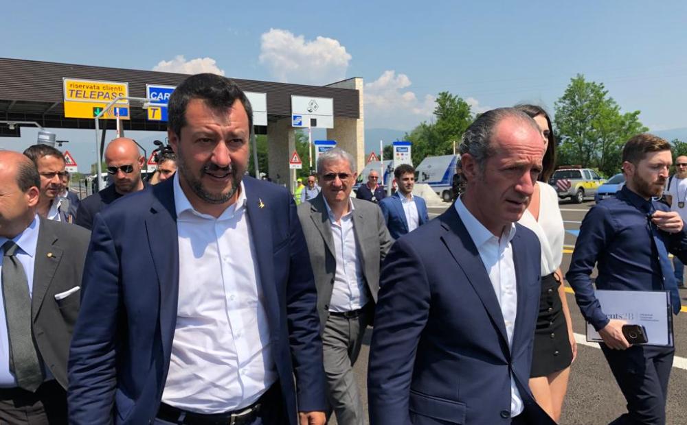 Il vicepresidente del Consiglio dei Ministri Matteo Salvini e il governatore Luca Zaia al casello di Breganze per l'inaugurazione
