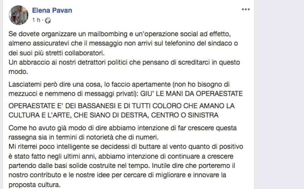 Così parlò dunque, o per meglio dire così scrisse sul social network un irritato sindaco di Bassano Elena Pavan. E Operaestate cammina ormai sui carboni ardenti.