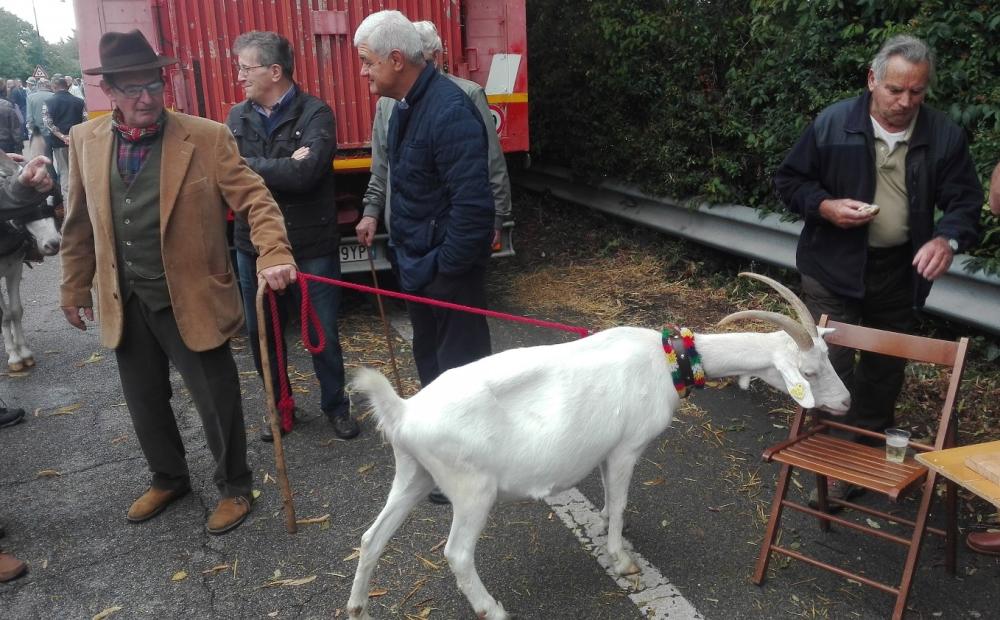 Una delle “star” della Fiera 2019 è senza dubbio una bellissima capra bianca, tenuta al guinzaglio dal suo proprietario, che dimostra di essere alquanto scaltra e di sapere bene il fatto suo. Altro che le capre di Sgarbi. Vicino al candido quadrupede dal collare multicolor è collocato infatti un tavolino dove in quel momento si svolge il vociante spuntino di alcuni addetti ai lavori: formaggio e salame, panini onti e via mangiando. Oro colato per l'intraprendente ovino che snobba totalmente il pubblico in strada rivolgendo il suo interesse esclusivo alla gustosa merenda al lato della strada. E ricevendo in cambio di cotanta attenzione una buona dose di bocconi al volo: mica scema la ragazza.