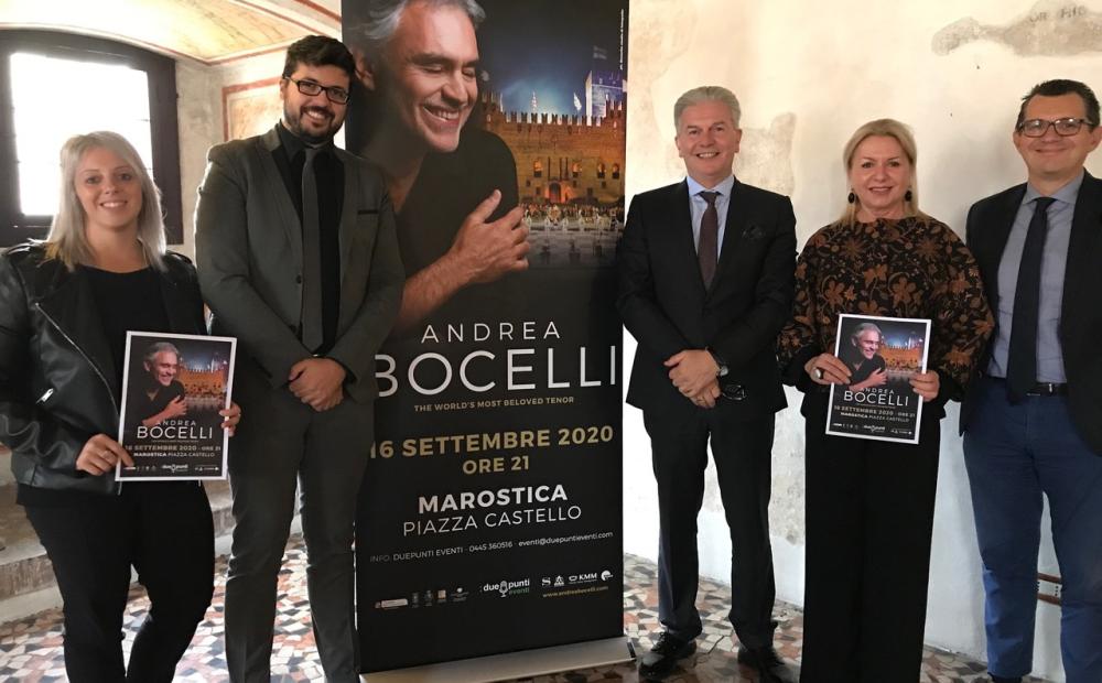 Il do di petto dell'amministrazione comunale di Marostica viene annunciato in conferenza stampa. Dopo lo straordinario successo del 2016, con un concerto esaurito in ogni ordine di posti, ritorna a Marostica Andrea Bocelli. Accadrà il 16 settembre 2020 nella piazza Castello che per l'occasione sarà allestita con le speciali tribune della Partita a Scacchi a personaggi viventi, che andrà in scena nei giorni precedenti al concerto (11, 12 e 13 settembre 2020). L'annunciazione del grande evento che verrà viene comunicata dal sindaco Matteo Mozzo, dall'assessore comunale al Turismo Ylenia Bianchin, dalla presidente della Confcommercio di Marostica Marisa Lunardon e da Valerio Simonato della DuePunti Eventi di Thiene, con cui il Comune scaligero ha siglato un contratto di cinque anni per l'organizzazione del programma degli eventi.