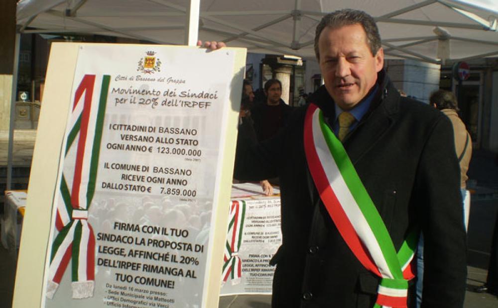 Maggioranza e opposizioni - eccezion fatta per la Lega Nord - con il sindaco Bizzotto in testa. I gruppi consiliari del Comune di Bassano si sono riuniti questo pomeriggio in un gazebo in Piazza Libertà per raccogliere le firme a sostegno del “Movimento dei sindaci per il 20% dell'IRPEF”.