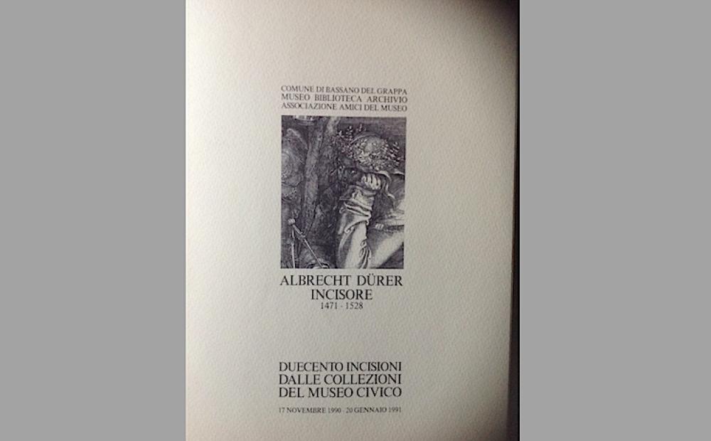 Si tratta del cataloghino di presentazione, edito da Grafiche Tassotti, della mostra “Albrecht Dürer incisore - Duecento incisioni dalle collezioni del Museo Civico”, allestita al Museo Civico di Bassano dal 17 novembre 1990 al 20 gennaio 1991, per l'organizzazione del Comune e del Museo Biblioteca Archivio di Bassano del Grappa e dell'associazione “Amici del Museo”, come si chiamava allora. In quell'epoca il direttore del Museo di Bassano era Paola Marini e nell'occasione venne esposto lo stesso e identico corpus di opere - 123 xilografie, e cioè incisioni su legno, e 92 calcografie, e cioè incisioni su metallo - che è stato esposto nella recente e tanto pubblicizzata mostra allo Sturm. Di quella mostra del '90-'91 si ricorda benissimo la prof.ssa Livia Alberton, Premio Cultura Città di Bassano nel 2010 assieme al compianto marito prof. Giambattista Vinco da Sesso. E ci mancherebbe: è lei infatti l'autrice del testo “Albrecht Dürer incisore”, che nell'opuscolo della mostra delinea biograficamente la figura del sommo artista rinascimentale tedesco di Norimberga. In occasione dell'apertura della mostra di 30 anni fa, in quello che allora si chiamava Museo Biblioteca Archivio di Bassano del Grappa, si svolse anche una tavola rotonda coordinata da Franco Garonna e da Paola Marini, con cinque relatori, tra cui il vescovo di Vicenza e docente universitario Pietro Nonis, sul tema “Omaggio a Dürer: il dolore morale”.