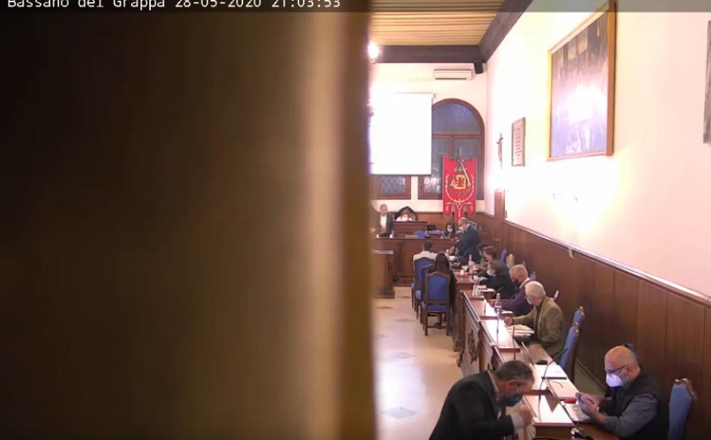 Consiglio comunale di Bassano: una tenda “appare” davanti alla videocamera della diretta streaming e nasconde i banchi di maggioranza (fonte immagine: YouTube)
