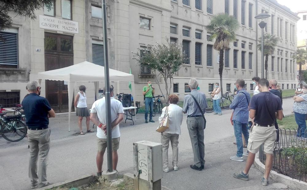 Assemblea pubblica di Gaia Bollini e Renzo Masolo, candidati di Europa Verde alle regionali, davanti alla scuola Mazzini. “Accorpare la Vittorelli alla Mazzini, creare un parco esteso e ridisegnare questa parte di città”
