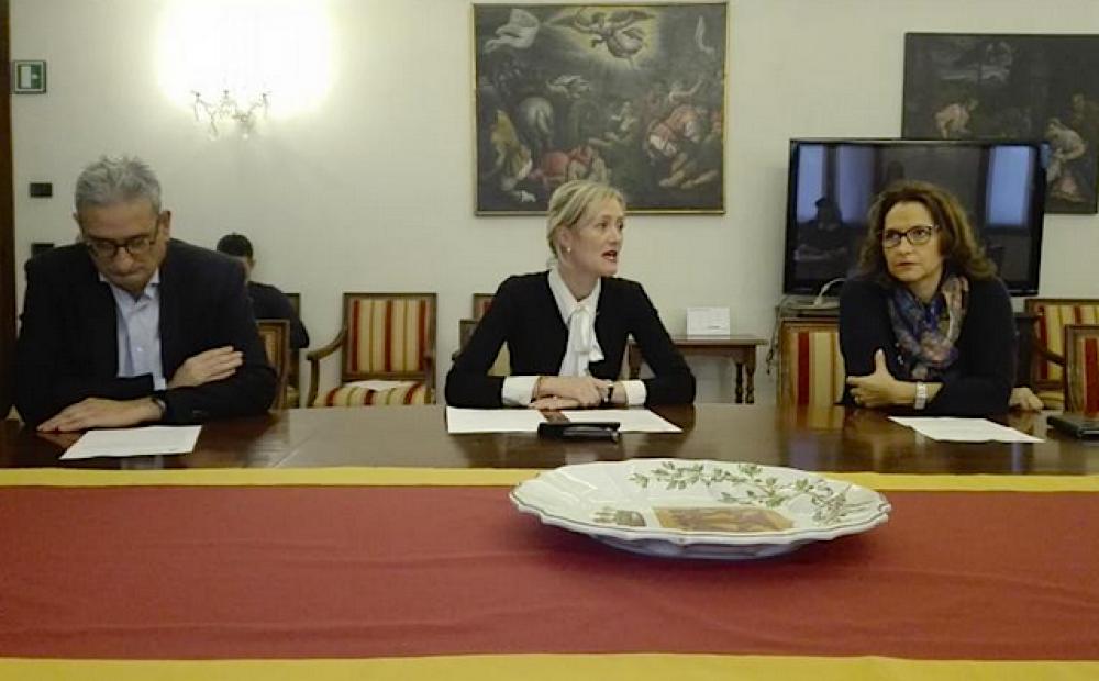 Il sindaco Elena Pavan, tra il segretario generale Antonello Accadia e il sindaco di Rossano Veneto Morena Martini, nella conferenza stampa del 24 febbraio 2020 (archivio Bassanonet)