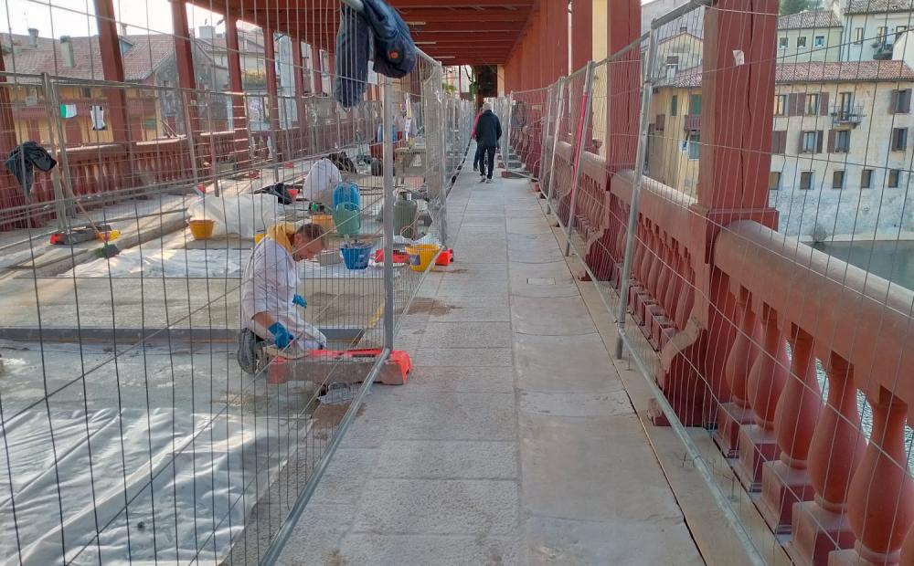 E così, pian pianino, senza fretta, con calma, il nuovo pavimento del Ponte di Bassano sta prendendo forma. Manca ancora la parte centrale, che è come avere la ciambella senza il buco, ma intanto una porzione della copertura del “piano di calpestio” è transitabile.